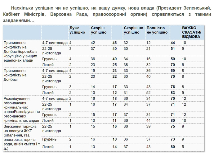 "В оцінці успішності влади у справі вирішення конфлікту на Донбасі відбулося погіршення порівняно з груднем: тільки 25% опитаних думають, що влада успішна (у грудні було 40%), а 70% - що не успішна (у грудні було 50%)".