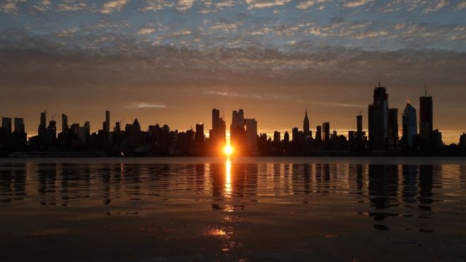 "Повне сонце" Мангеттенхенджу можна спостерігати двічі на рік: 29 травня і 13 липня, але 30 травня і 12 липня між хмарочосами з'являється рівна половинка сонця - теж гарна картинка.