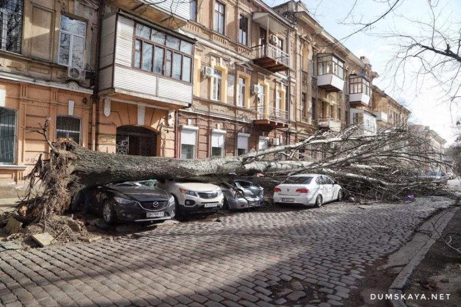 Станом на 13:00 буревій повалив 48 дерев. В Покровському провулку дерево впало одразу на сім автомобілів.