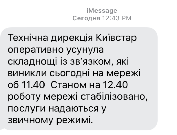 "Як тільки-но причини будуть встановлені, ми повідомимо. Вони невідомі, але найближчим часом мережа відновиться" - повідомила представник Київстар Катерина Резниченко.