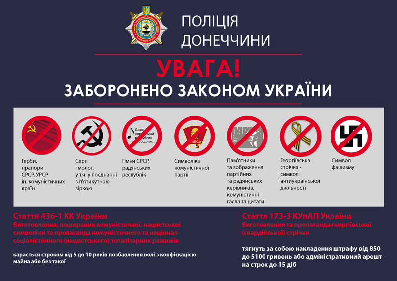 На сьогодні в Україні заборонені законом виготовлення, поширення та пропаганда символіки комуністичних партій, георгієвської стрічки та символів фашизму. Тим, хто вивісить прапор СРСР або співатиме гімн радянських республік, загрожує кримінальна відповідальність.