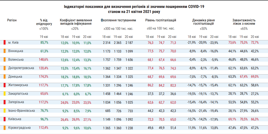 Згідно із даними Міністерства охорони здоров'я, станом на 21 квітня завантаженість ліжок на Донеччині становить 69,0%. Якщо цей показник буде перевищувати 65% протягом трьох діб, то регіон може перейти до "червоного" рівня епіднебезпеки.