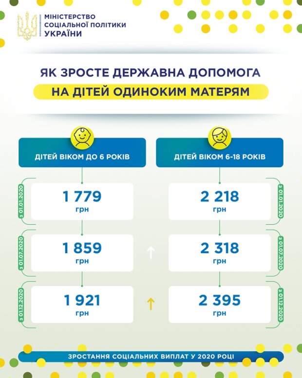 Як і інші соціальні виплати, цей вид допомоги буде підвищено у три етапи. З першого січня розмір допомоги на дитину до 6 років становить 1779 гривень. Першого липня ця сума збільшиться до 1859 гривень, а першого грудня — до 1921 гривень.