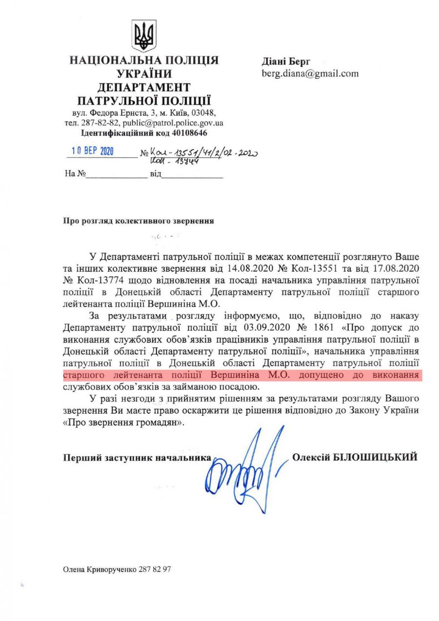 "У департаменті патрульної поліції розглянуто колективне звернення. За результатом повідомляємо, що начальника управління Патрульної поліції в Донецькій області старшого лейтенанта поліції Вершиніна М.О. допущено до виконання службових обов'язків за посадою".
