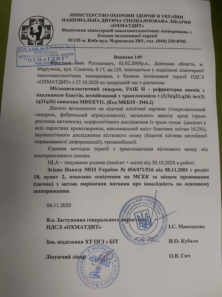 Єдиний спосіб вилікувати хлопчика це зробити трансплантацію кісткового мозку. На жаль, в Україні таку операцію зробити не можуть через відсутність досвіду.