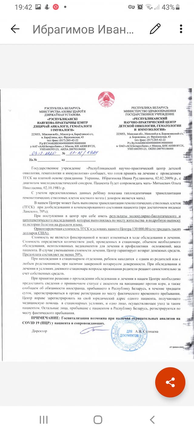 Операцію з трансплантації кісткового мозку можуть зробити лікарі із Білорусі. Для цього потрібно зібрати суму у 130 тисяч доларів за місяць.