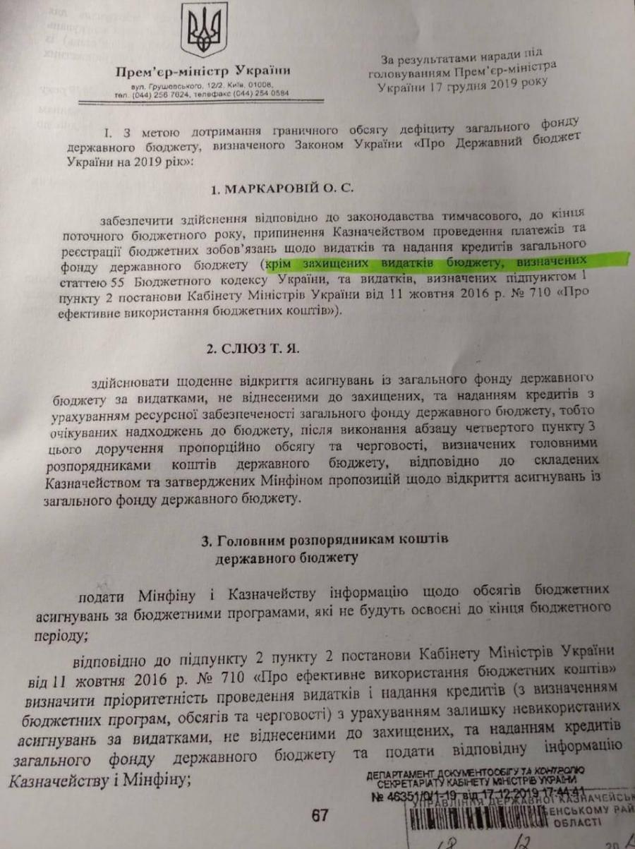 У той же час народний депутат Олексій Гончаренко оприлюднив доручення прем'єр-міністра України Олексія Гончарука припинити до кінця поточного бюджетного року Казначейством проведення платежів та реєстрацію бюджетних зобов'язань щодо видатків та надання кредитів загального фонду державного бюджету крім захищених видатків бюджету.