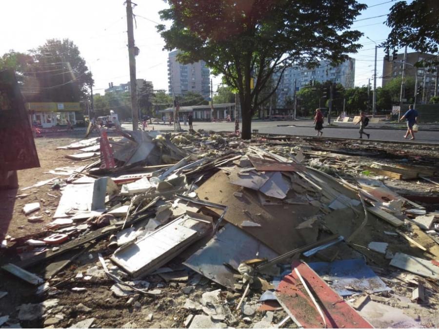 В Маріуполі на перехресті проспектів Миру та Будівельників продовжили демонтувати кіоски. Від МАФів з сигаретами, кавою та шаурмою залишились лише уламки й купи сміття.