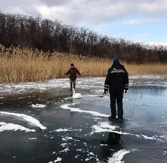 Подія сталась сьогодні вранці. Мобільна рятувальна група врятувала лебедя. В нього лапа примерзла до льоду. Виявилось, що тварина сильно пошкодила ногу та не змогла злетіти. Її спіймали та відвезли до зоопарку. Там лебедю надали допомогу.