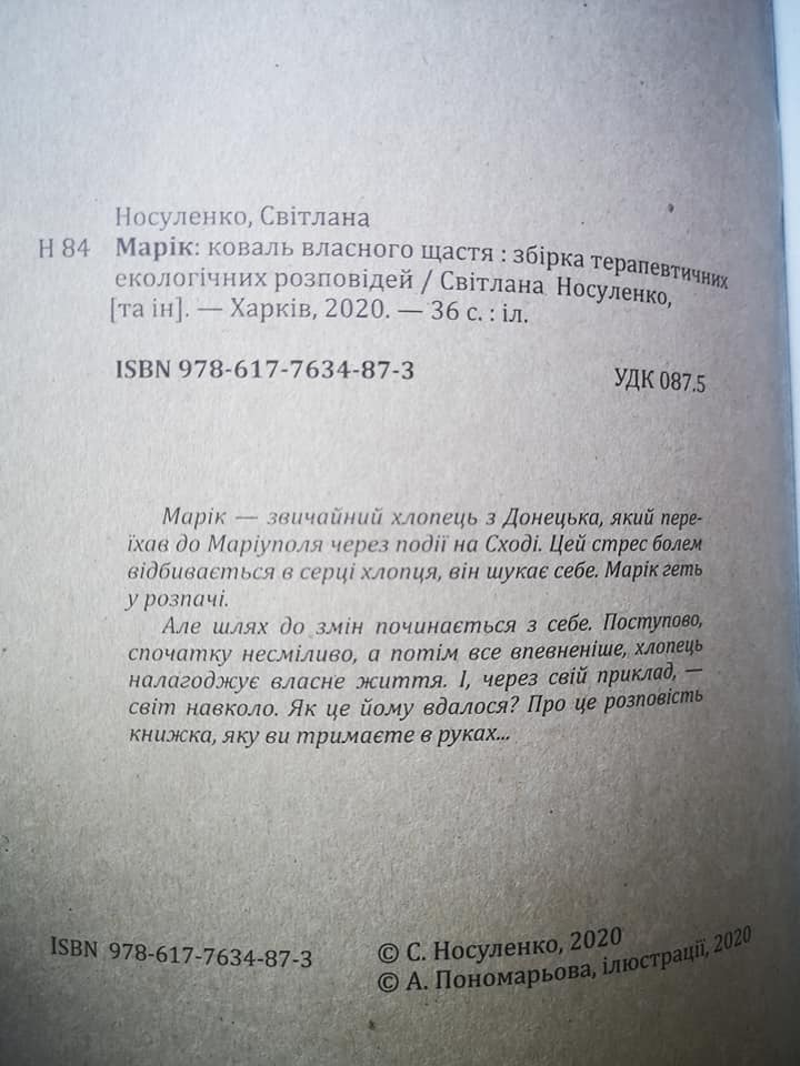 Маріупольчанка Світлана Носуленко надрукували дитячу книгу "Марік: коваль власного щастя". Вона - про екологію, пізнання світу і про те, що зміни починаються з нас.