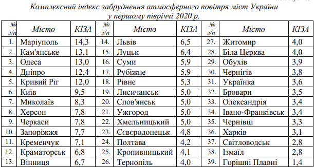 Так, у Маріуполі за перше півріччя 2020 року рівень забруднення повітря оцінювався як дуже високий. Комплексний індекс забруднення атмосферного повітря у Маріуполі становить 14,3.