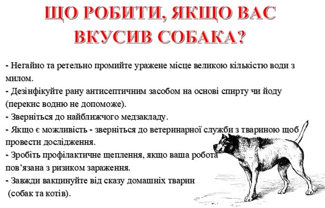 - Пам'ятайте, що при укусах тварин також можливе зараження збудником правця. Щеплення проти правця доступні в державних комунальних закладах.