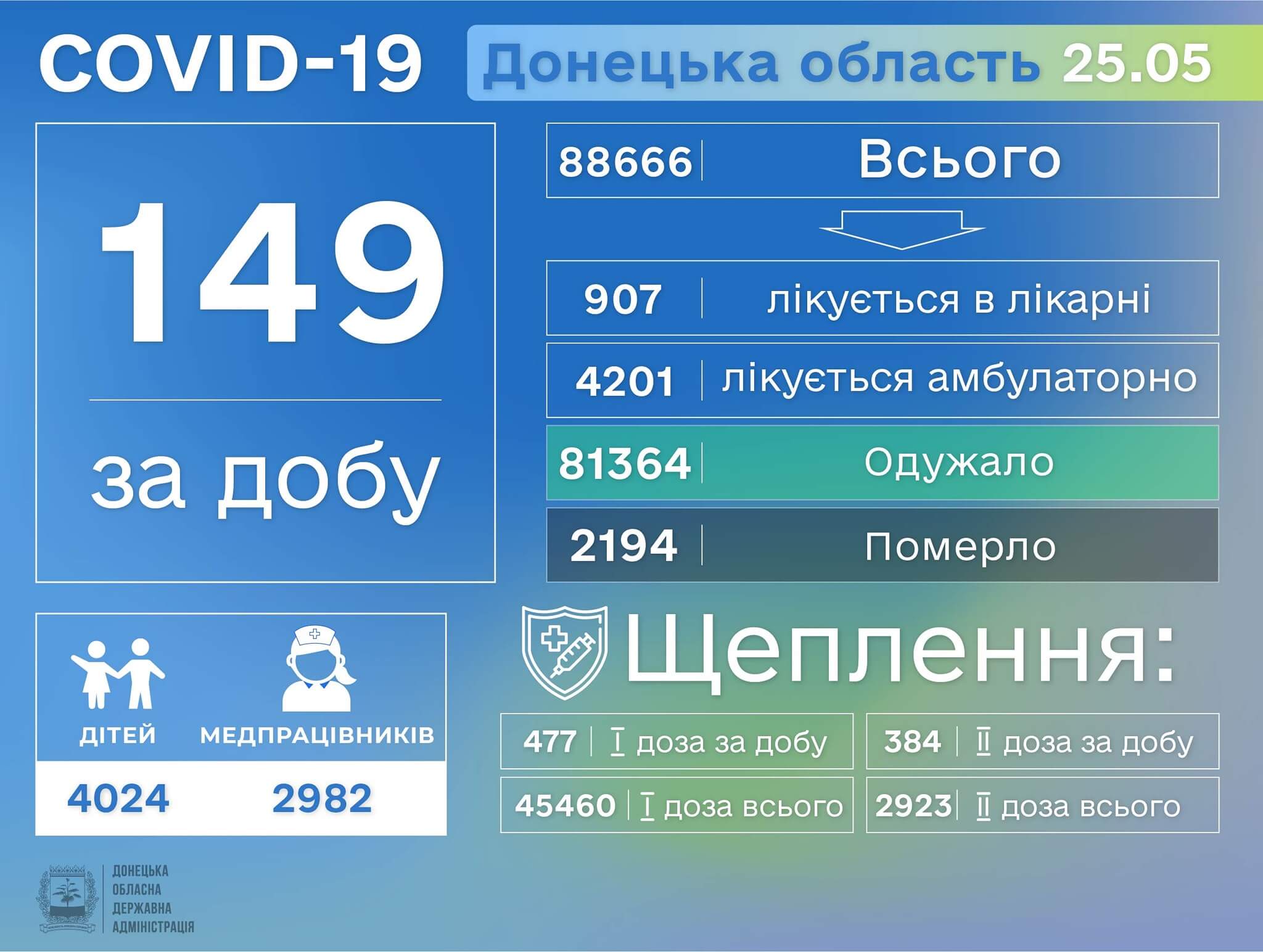 На Донеччині знизилась кількість виявлення нових випадків інфікування коронавірусом. За минулу добу, 25 травня, хворобу підтвердили у 149 людей.