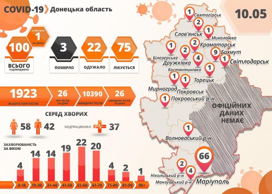 "Один новий випадок захворювання лабораторно підтверджено протягом цієї доби, 10 травня, на Донеччині - у 32 річного жителя Мангушського району. Таким чином, з початку оголошення карантину маємо 100 лабораторно підтверджених випадків коронавірусної хвороби", - написав він.