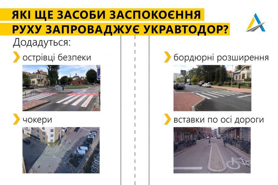 "Нові стандарти дозволять встановити острівці безпеки, які змусять водія дещо змінити траєкторію руху, чокери – суцільні розширення або острівці, що звужують проїзну частину. А також центральні (підняті) острівці, що розташовані вздовж осі проїзної частини", - вказано на сторінці.