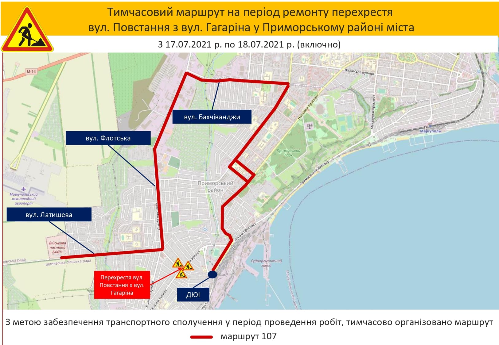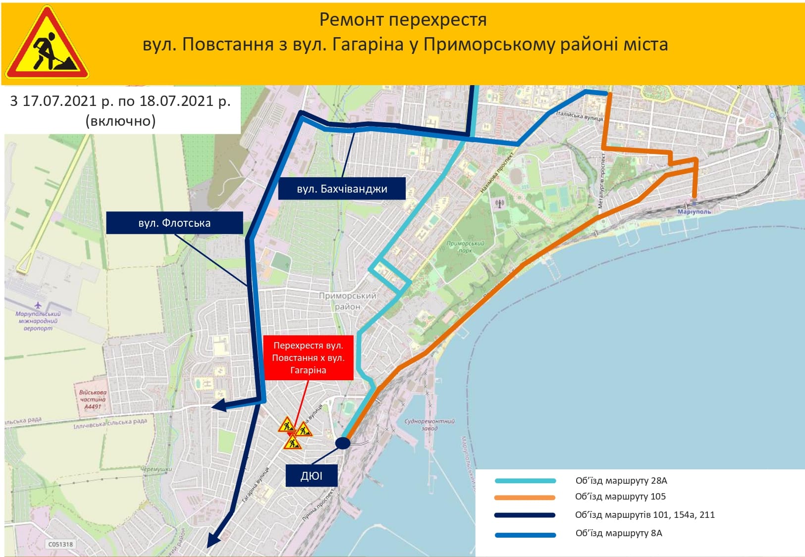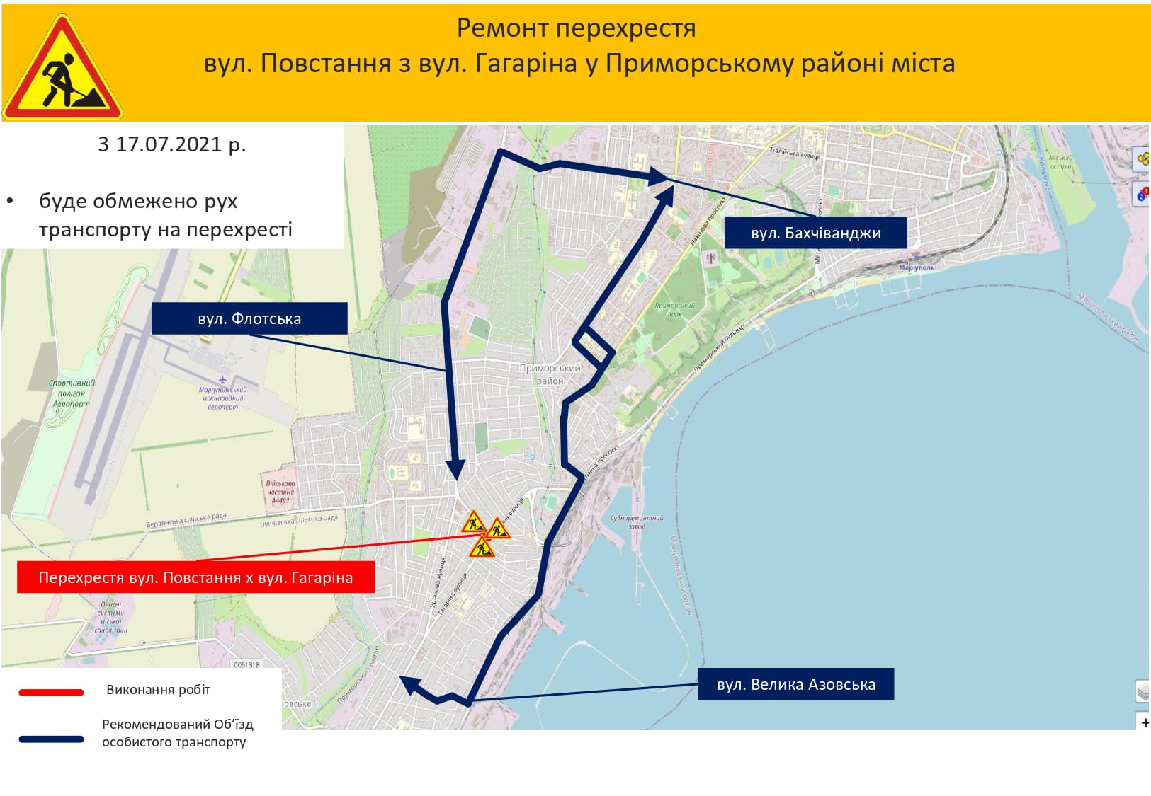 У Приморському районі Маріуполя на вихідних тимчасово зміниться схема руху через ремонт. На перехресті вулиці Повстання та вулиці Гагаріна будуть замінювати асфальт.
