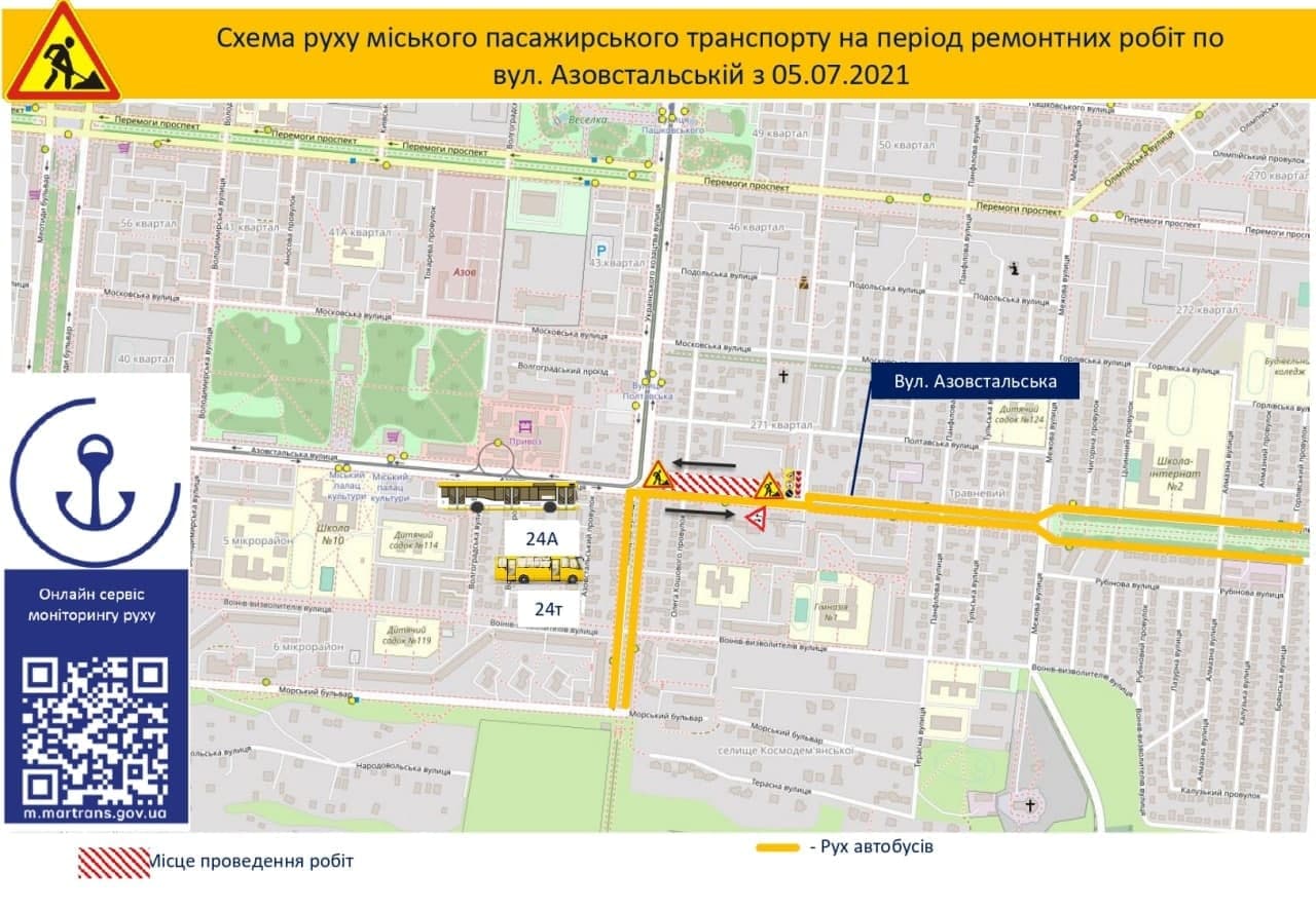 "У зв’язку з виконанням планових робіт з метою підвищення якості надання послуг КП "Маріупольське ВУ ВКГ" у Лівобережному районі з 05.07.2021 починаються планові роботи на ділянці по вул. Азовстальській від вул. Українського козацтва до вул. Зої Космодем’янської у зв’язку з чим буде частково обмежено рух", - вказано у повідомленні.
