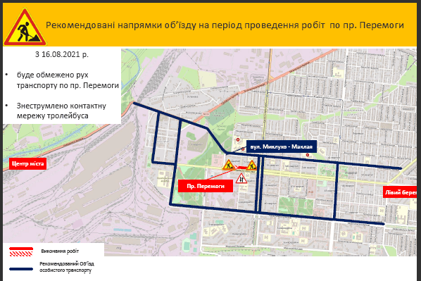 Там знеструмлять контактну мережу тролейбусів. А рух транспорту по пр. Перемоги буде організовано по зустрічній смузі.