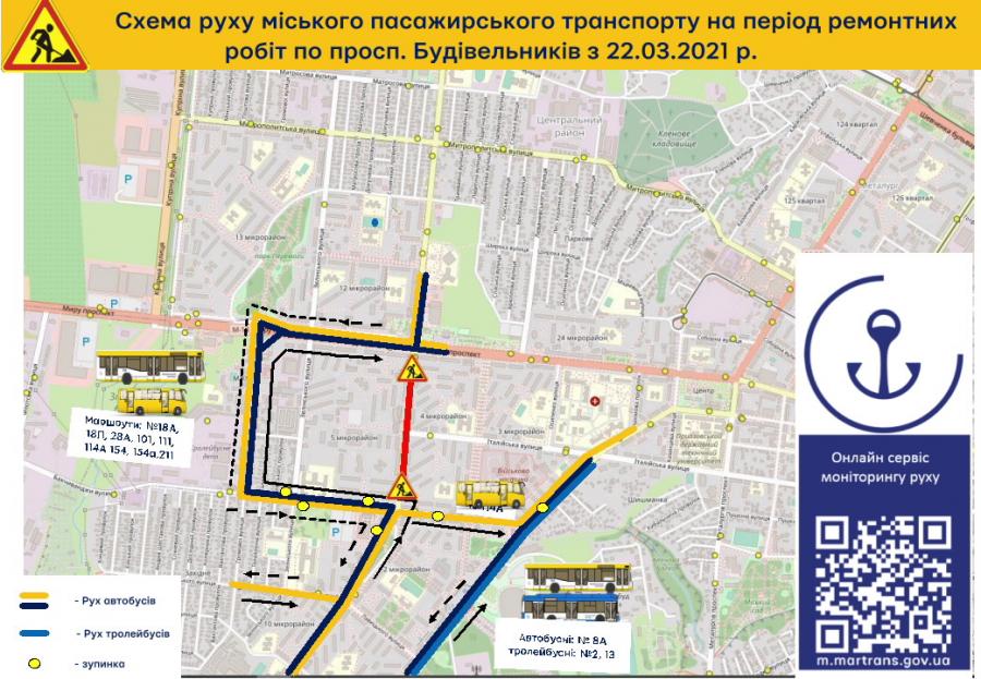 В Маріуполі з понеділка, 22 березня, ще одну ділянку дороги на пр. Будівельників закриють для транспорту. Через це маршрутка №114а рухатиметься в об‘їзд.