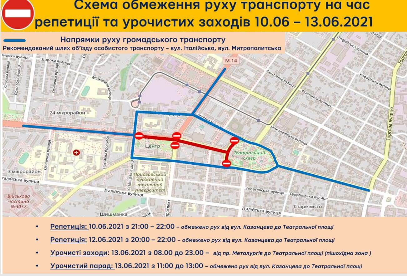 З 8:00 до 23:00 13 червня буде закрито рух транспорту по просп. Миру від просп. Металургів до Театральної площі (вул. Університетська та вул. Соборна). Рух пасажирського транспорту буде організовано об’їзними напрямками по вул. Казанцева, вул. Університетська та вул. Соборна.