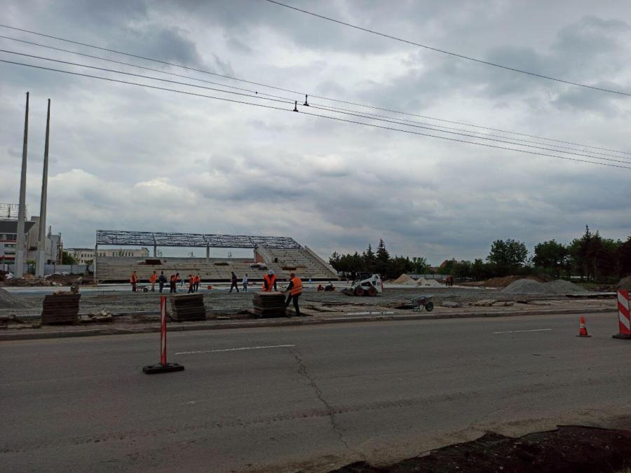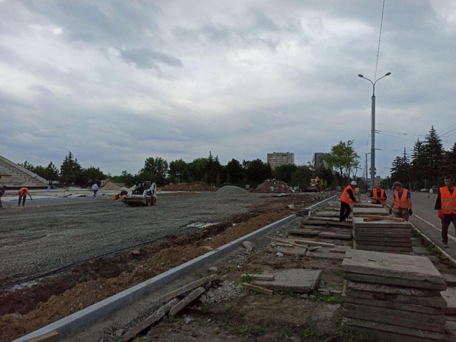 Будівельники по всій території площі зараз висипають будівельне каміння, а також прибирають стару плитку.