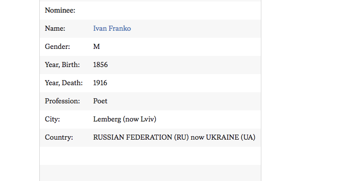 "На офіційному сайті Нобелівського комітету Франко раптом став громадянином... Російської федерації. Саме так визначено країну (country), з якої походив номінант, у базі даних номінацій на премію з літератури у 1916 році", — йдеться у повідомленні.