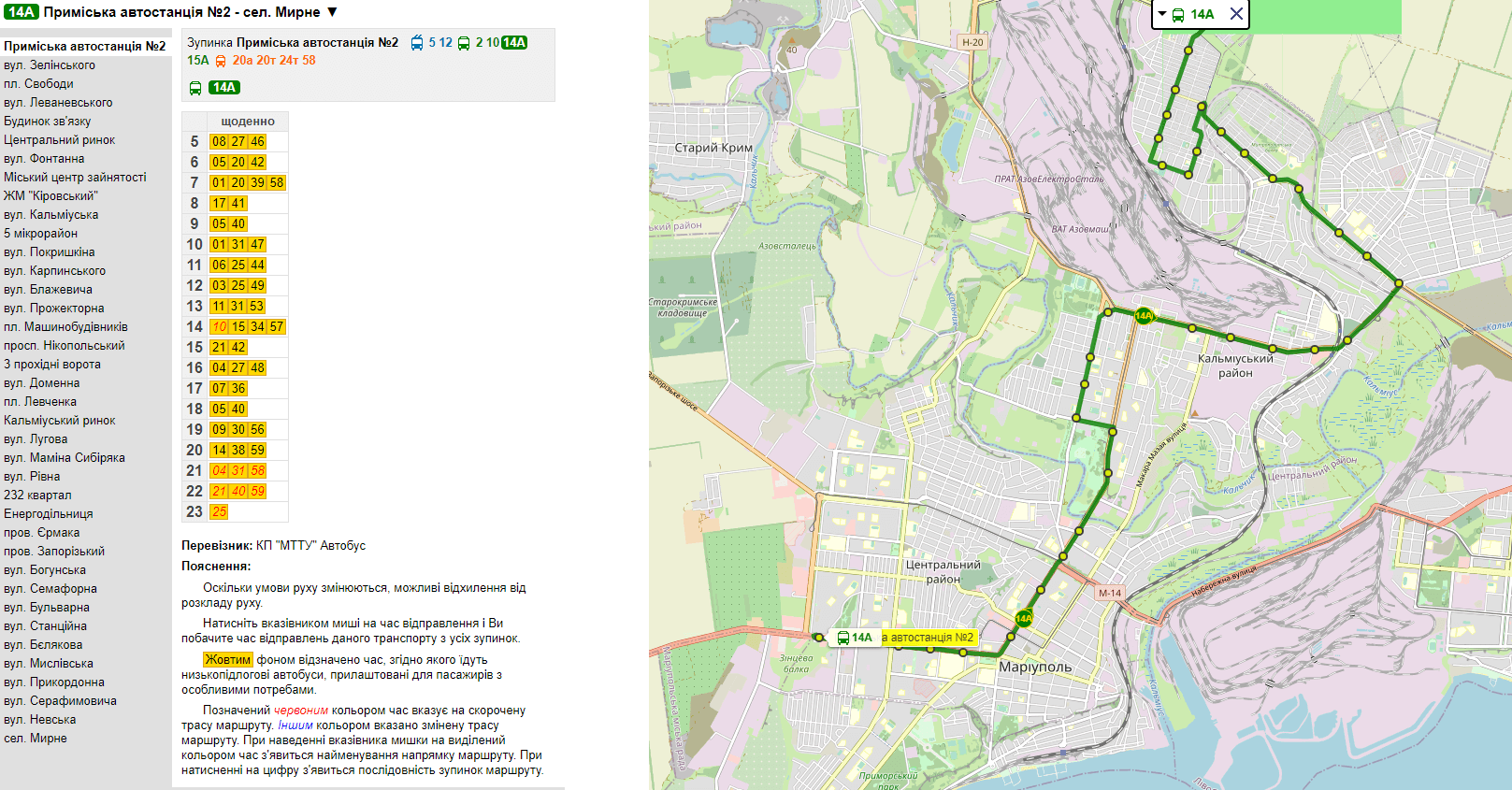 Оновлений маршрут з'явився на карті martrans.gov.ua. Автобус MAN їздить під №14А. Маршрут починається з Приміської автостанції №2, через Центральний ринок, ЖМ "Кіровський", вул. Карпинського, Кальміуський ринок, вул. Семафорну до сел. Мирне. Свій маршрут автобус долає 1 годину і 7 хвилин.