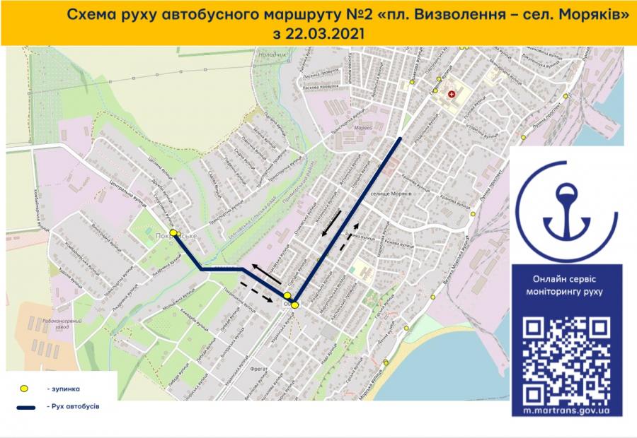 Маршрут комунального автобуса №2, який починається з пл. Визволення до сел. Моряків подовжить схему руху до сел. Покровське.