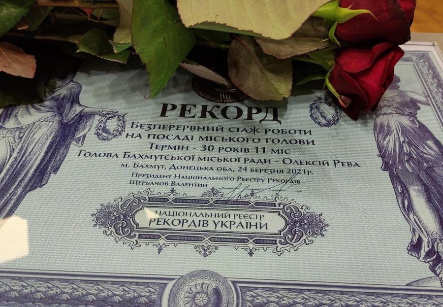 Мер м. Бахмут Олексій Рева став рекордсменом України за найтриваліший термін на посаді міського голови. Він безперервно керує містом вже більше 30 років.