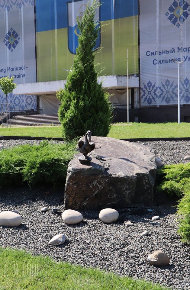 Першою своє місце перед згорілою будівлею міськради Маріуполя знайшла скульптура пелікана. Її фото вже оприлюднили в мережі.