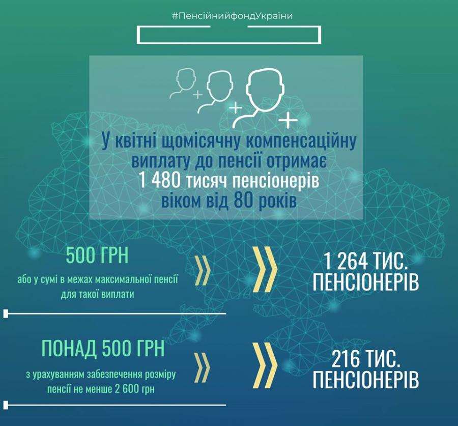 "З 1 квітня 2020 року пенсіонерам, які досягли віку 80 років і старше, до пенсій встановлено щомісячну компенсаційну виплату у розмірі до 500 гривень. Компенсаційну виплату отримуватимуть пенсіонери, у яких пенсія не перевищує 9205 гривень. Водночас, після встановлення такої виплати пенсія не може бути більше зазначеного розміру", - заявили в ПФУ.