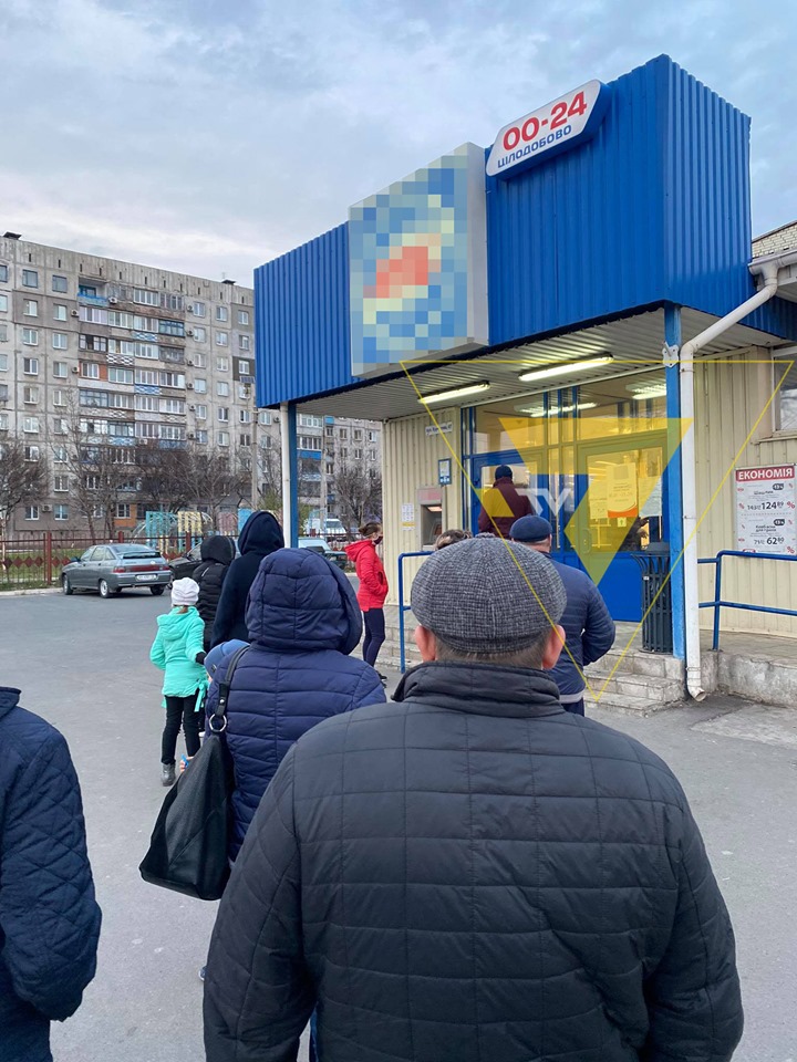 Десятки маріупольців зібрались біля дверей одного з супермаркетів. Люди шикуються один за одним. Схожа ситуація і в іншій торговій мережі - тільки зсередини, біля кас.