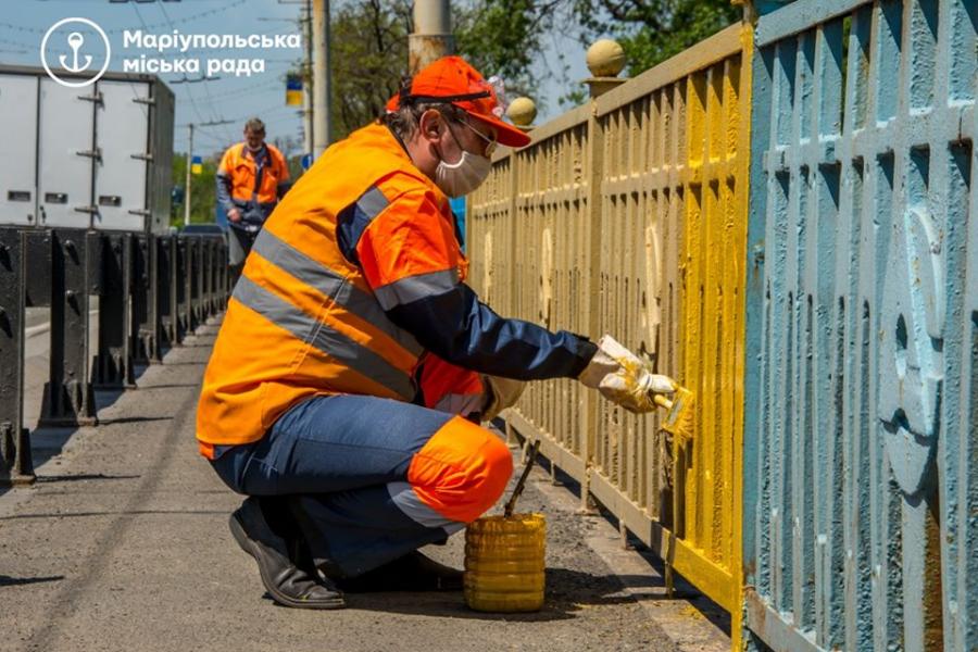 Сьогодні, 12 травня, у Маріуполі за програмою "Охайне місто" на роботу вийшли перші працівники. Вони проводили фарбування леєрної огорожі Пост-моста. Про це повідомляється на сторінці міської ради у Facebook.