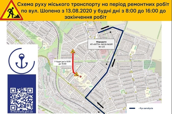 З 13 серпня у будні дні з 8:00 до 16:00 до закінчення робіт буде змінено рух транспорту по вул. Шопена. Це пов'язано із ремонтом вулично-дорожньої мережі на ділянці від вул. Металургійна до вул. Приазовська.