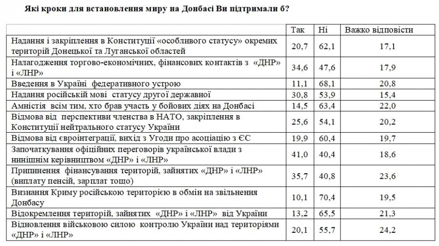 Також переважно відкидаються громадською думкою такі компроміси задля досягнення миру на Донбасі: амністія всім тим, хто брав участь у бойових діях на Донбасі (не підтримують 63%, підтримують - 14,5%), відмова від євроінтеграції, вихід з Угоди про асоціацію з ЄС (не підтримують 60%, підтримують - 20%), надання російській мові статусу другої державної (не підтримують 54%, підтримують - 31%), відмова від перспективи членства в НАТО, закріплення в Конституції нейтрального статусу України (не підтримують 54%, підтримують - 26%).