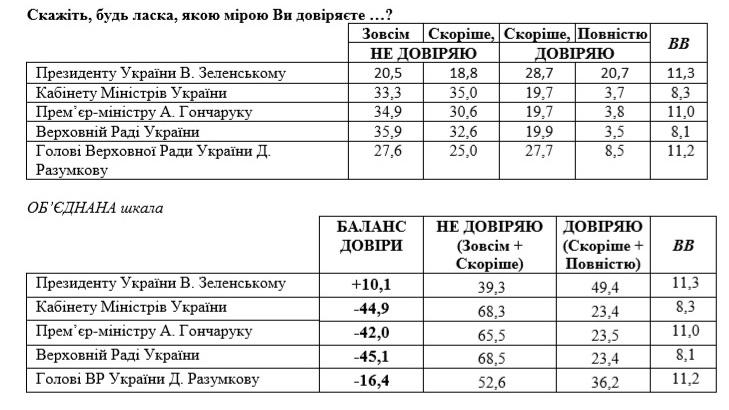 Зовсім не довіряють Зеленському 20,5% опитаних, швидше не довіряють — 18,8%. Скоріше довіряють президенту 28,7%, ще 20,7% - повністю довіряють, а 11,3% опитаних вибрали пункт «Складно відповісти».