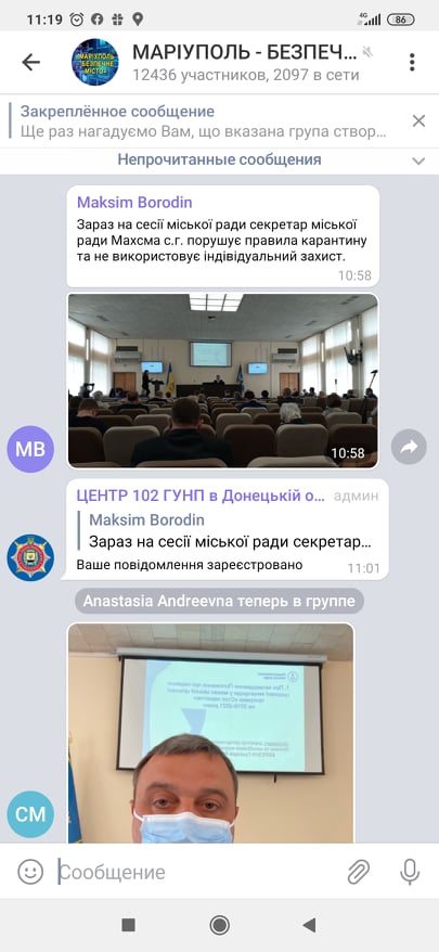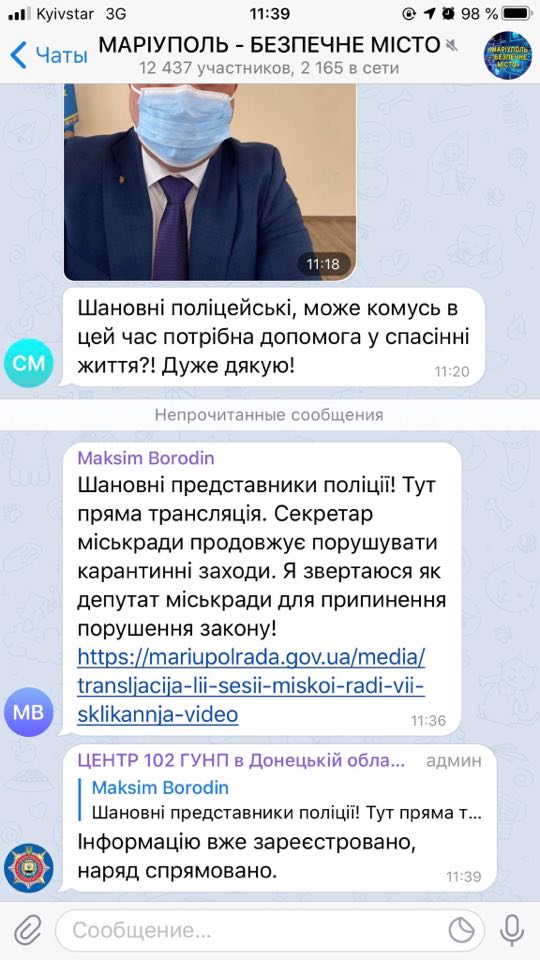 Депутат Маріуполя Максим Бородін звернувся до поліцейських із повідомленням, що секретар міськради Степан Махсма під час карантину не використовує маску у громадському місті. А саме - на засіданні сесії. Про це йдеться в Telegram-каналі "Маріуполь - безпечне місто".