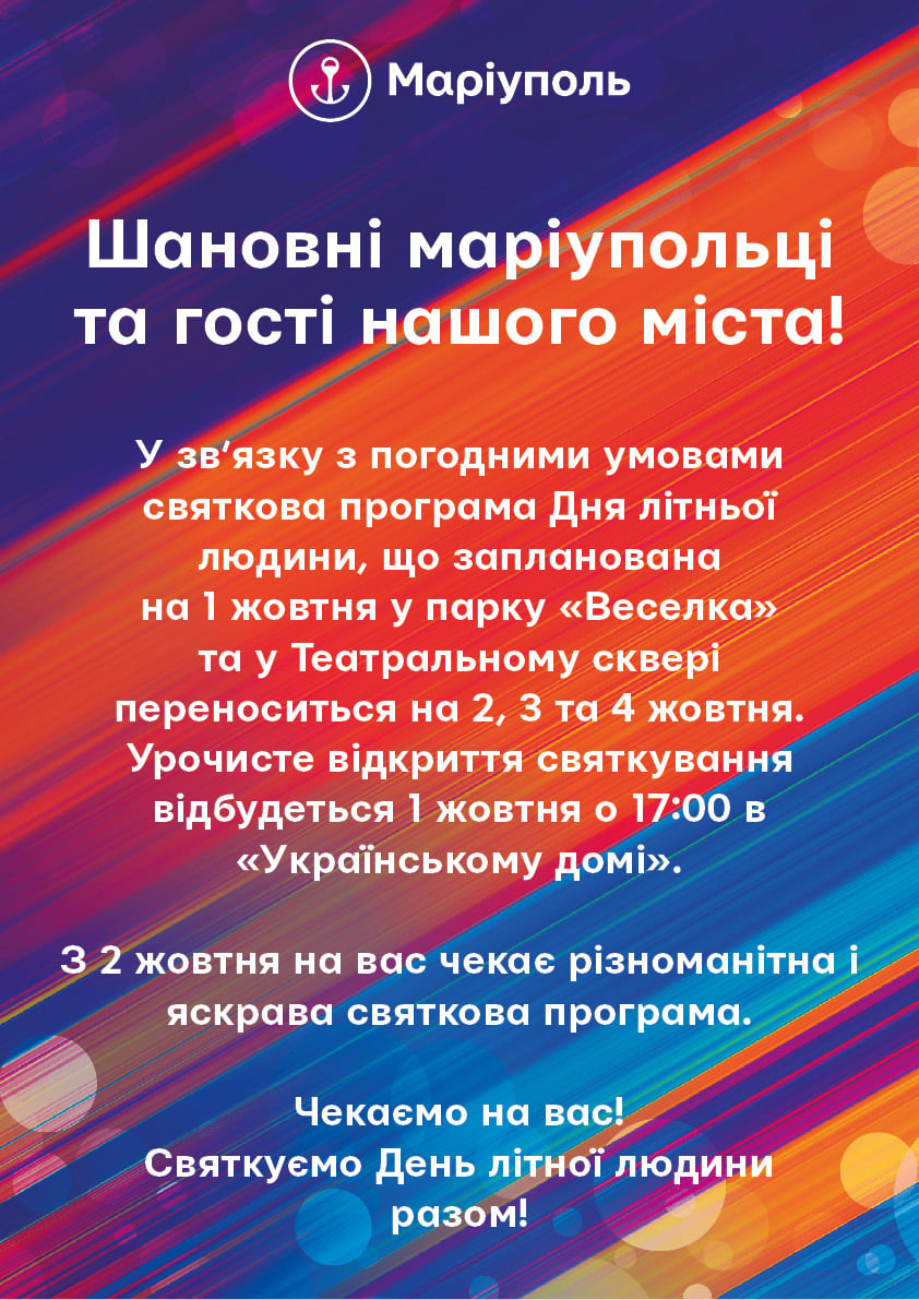 "Святкова програма дня літньої людини, що запланована на 1 жовтня у парку "Веселка" та театральному сквері, переноситься на 2, 3 та 4 жовтня. Урочисте відкриття святкування відбудеться 1 жовтня о 17:00 в "Українському домі".