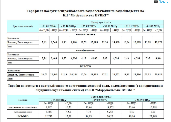 Таким чином, для населення, бюджетних організацій та інших споживачів в Маріуполі послуга водопостачання подорожчала до 19,176 грн (з ПДВ) за кубометр, а водовідведення - до 8,844 грн (з ПДВ). В сумі кубометр води підвищився в ціні на 5,424 грн або на 24% і тепер становить 28,02 грн (з ПДВ).
