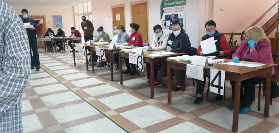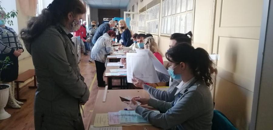Біля кожного стола члена комісії черга складається з трьох осіб. На підлозі є позначка жовтим скотчем дистанції. Маріупольців просять вдягати маску. На деяких дільницях нехтують правилом - не давати в руки члену комісії власний паспорт.