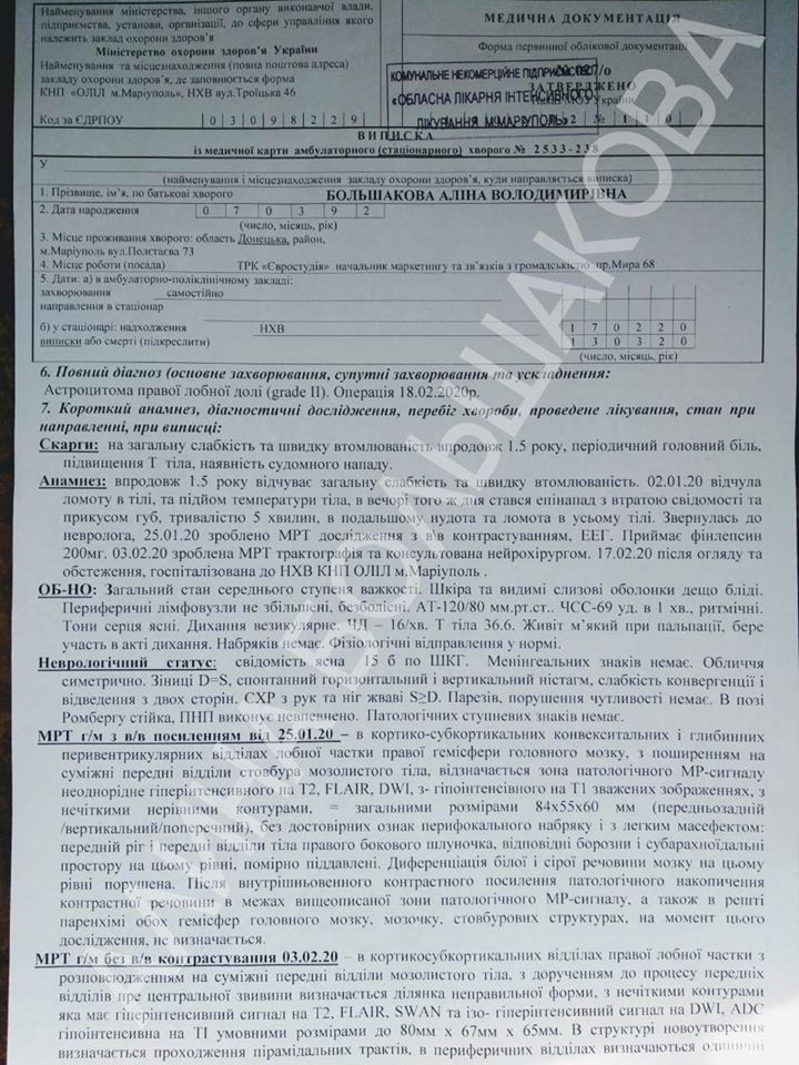 «19 березня в мене діагностували злоякісну пухлину головного мозку. 18 лютого мені хірургічно видалили 80% пухлини. Залишки в тканинах головного мозку підлягають променевій та хіміотерапії. На жаль, у нас в Маріуполі немає лінійного прискорювача для проведення такої процедури. Але він є в Києві, Харкові, Дніпрі, але ціни просто непідйомні для нашої родини» - пише дівчина в соцмережі.