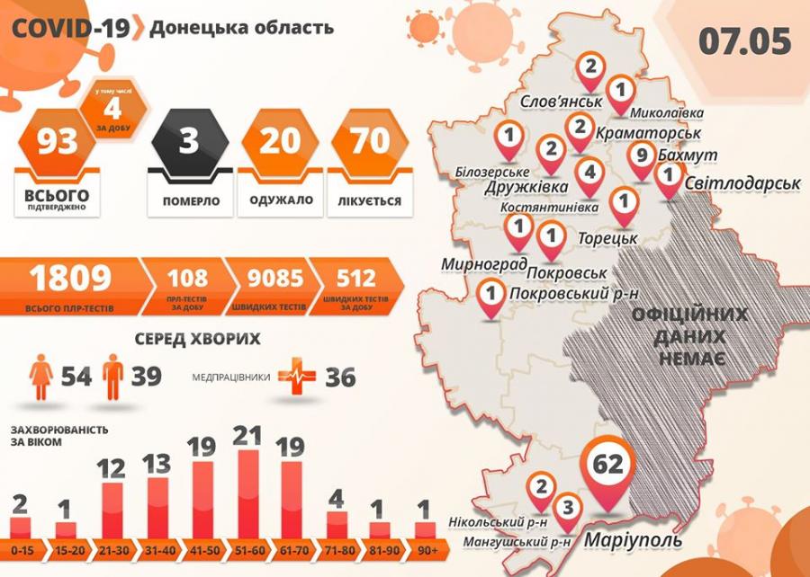 "Таким чином, станом на сьогодні з початку оголошення карантину в Донецькій області зареєстровано 93 випадки COVID-19. Три з них завершилися летально, 20 пацієнтів одужали, 70 продовжують лікування. Загалом, ситуація із захворюваністю в області контрольована, і залишатиметься такою надалі, якщо кожен з нас дотримуватиметься рекомендацій та тимчасових обмежень", - підкреслив він.