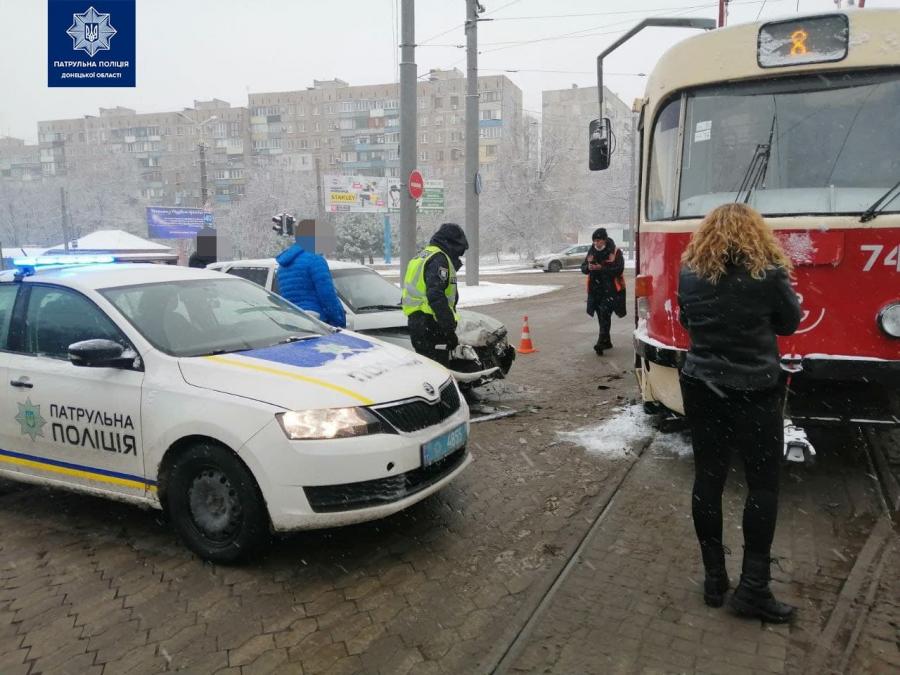 У Центральному районі Маріуполя трамвай зіткнувся із автівкою. Про це з місця події повідомили свідки.