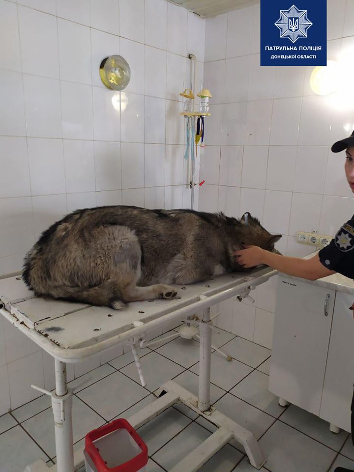 Екіпаж патруля прибув на місце та виявив чотирилапу, що лежала неподалік. Правоохоронці одразу помітили, що у тварини є травми лап, тому собаку пересадили до автомобіля та відвезли до ветеринара. Лікар підтвердила, що у дівчинки переламана лапа, та вона ймовірно вагітна