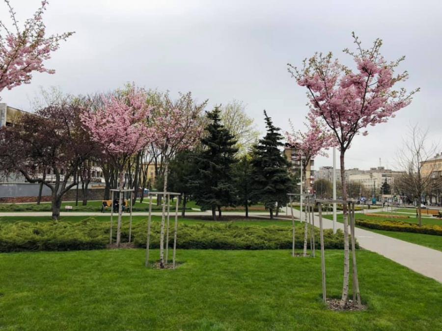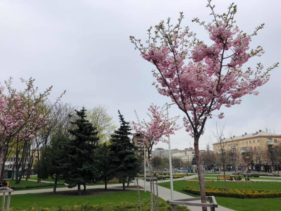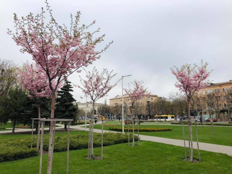У Маріуполі на Грецькій площі, біля згорілої будівлі виконкому, розквітла японська вишня. У нашому місті дерева сакури мають ніжні рожеві квіти. Особливістю сорту дерев є те, що бутони з'являються і розпускаються набагато раніше ніж листя. Період цвітіння складає всього кілька тижнів.