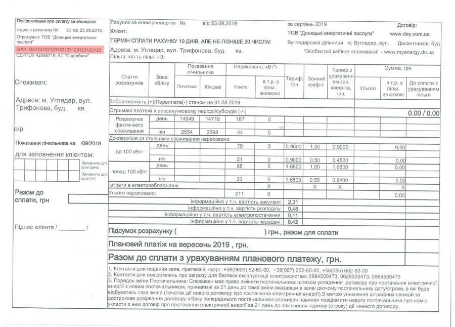 Відтепер у платіжках за електроенергію рахунок отримувача коштів буде вказано за новим стандартом IBAN. Це міжнародний формат платежів, на який переходять усі банки України. Тепер у реквізитах замість номеру рахунку та коду банку (МФО) буде вказаний лише номер рахунку з 29 знаків (літер та цифр).