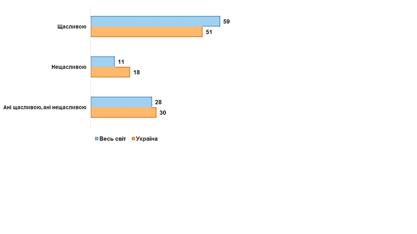 На кінець 2019 року 51% українців вважали себе щасливими і тільки 18% вважали своє життя нещасливим. Про це свідчать дані міжнародного опитування Gallup International, яке в Україні проводив КМІС.
