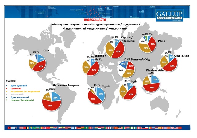 Більше половини респондентів країн, де проводилось дослідження (59%) відповіли позитивно, біля одного з десяти (11%) вважають себе нещасливими. Трохи більше четвертої частини опитаних (28%) вважають себе ані щасливими, ані нещасними. Тобто відповідний, середній індекс склав 48%. Таким чином в Україні він дещо нижчий, ніж у світі в цілому (нижчий так званого "світового індексу щастя").