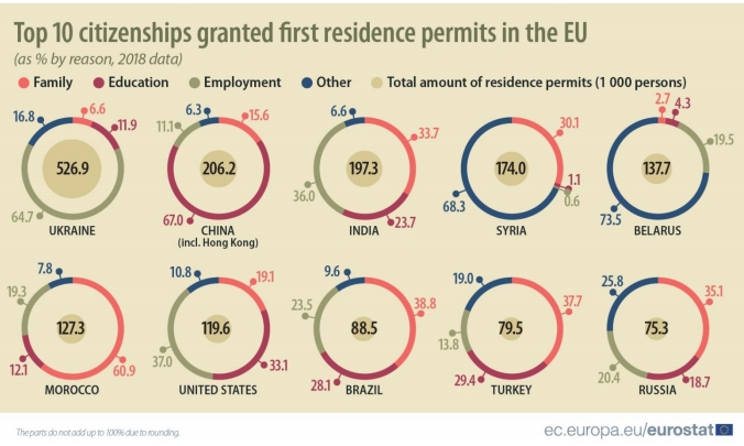 За даними статистичного відомства ЄС, в 2018 році громадяни України отримали 527 тис. дозволів на проживання, з яких 78% у Польщі, і знову зайняли перше місце.