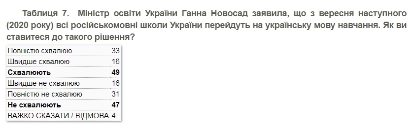 Половина українців (49%) чи іншою мірою схвалюють заяву міністра освіти Ганни Новосад про те, що з вересня 2020 року всі російськомовні школи України перейдуть на українську мову навчання. Про це свідчать дані опитування Київського міжнародного інституту соціології.